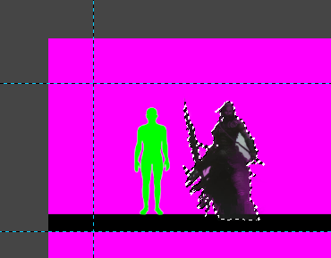 Copy your cleaned character image and paste it into a new layer in the template. Use the move and resize tool to position it so its feet are in contact with one of the three black bars and it is the correct height in relation to the green figures. If you want to create larger characters beware of overlapping the horizontal guide lines since this might cause tokens to collide later in the process.