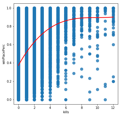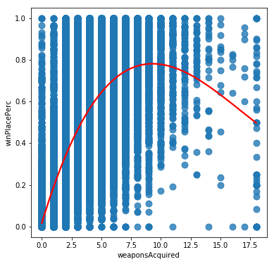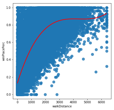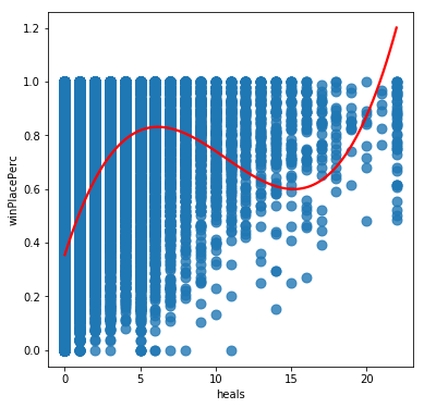 The plots show a variety of different relationships to winPlacePerc. Some of these look reasonably linear, however some seem to be rather more complicated. We should check this, since if the data is non-linear, then we may need a more sophisticated model to account for this. The easiest way is to try to plot a polynomial regression to the data and look to see if we get a monotonically increasing line. If not then it is unlikely linear regression will give us a good fit.