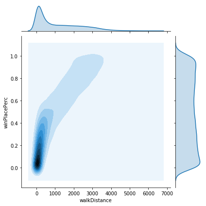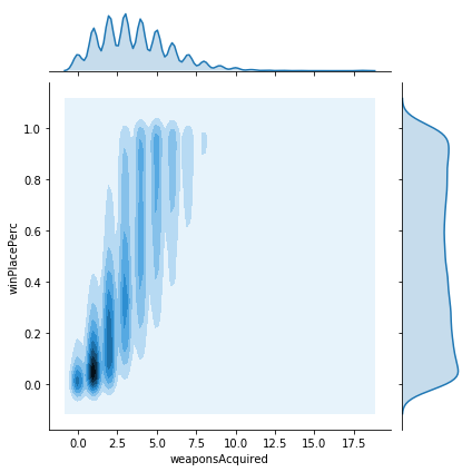 From these we can see that while some variables like Walk distance and kills could be approximated by a linear relationship, others such as weaponsAcquired have a definite sweet spot for high winPlacePercentage scores, and others such as heals have a complicated relationship possibly suggesting a number of competing strategies being used by effective players. It seems likely that we will need to base our model on something more sophisticated than linear regression for this challenge.