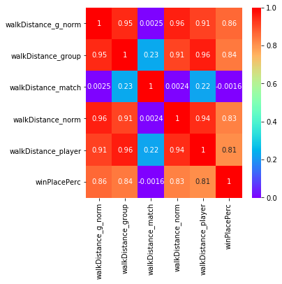 The correlation plots clearly show that the grouped and normed features show a higher correlation with winPlacePerc than the variables before engineering. Clearly we should consider including them in our model.