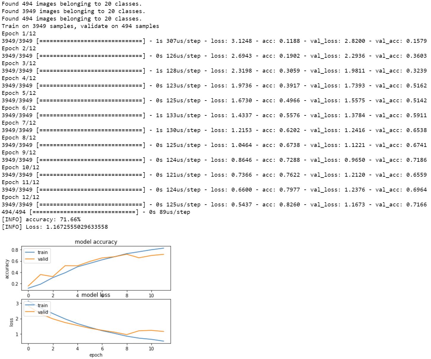 this suggests that we should extend the early stopping for our training from 6 epochs to 8 or even 12. Stopping after 12 epochs gives us better validation set accuracy (72%) and better validation set lower loss (1.17) than our original CPU runs ( accuracy of 66% and loss of 1.22) in a mere fraction of the time as seen below