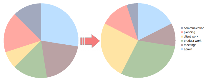 The next useful thing to do with time usage pie charts is to draw up charts of how people believe their time should be divided between tasks. Once again this can be done by both the person seeking to improve their time management and their coworkers and manager. These charts of desired time allocation will give an indication of where time investment needs to be trimmed from tasks and where it needs to be added. It can also highlight tensions in how different parts of a team believe time should be spent. This allows for negotiation on the best use of time. Completing this exercise makes it a lot easier to plan what concrete actions are needed in order to reallocate time to higher priority tasks.